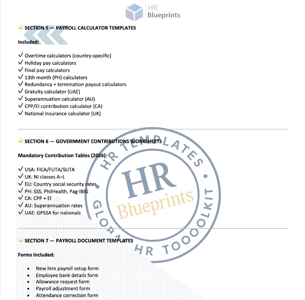 It gives youΒ ready-to-use policies, SOPs, calculators, checklists, and country guidesΒ so you can run payrollΒ accurately, legally, and consistentlyΒ acrossΒ USA, EU, UK, Philippines, Canada, Australia, and UAE.