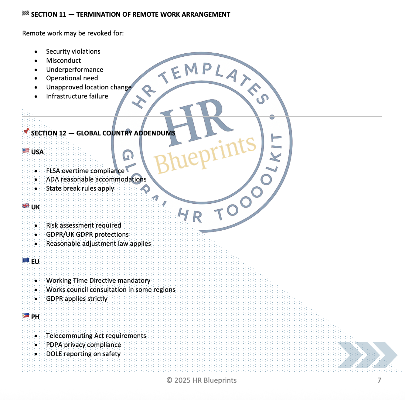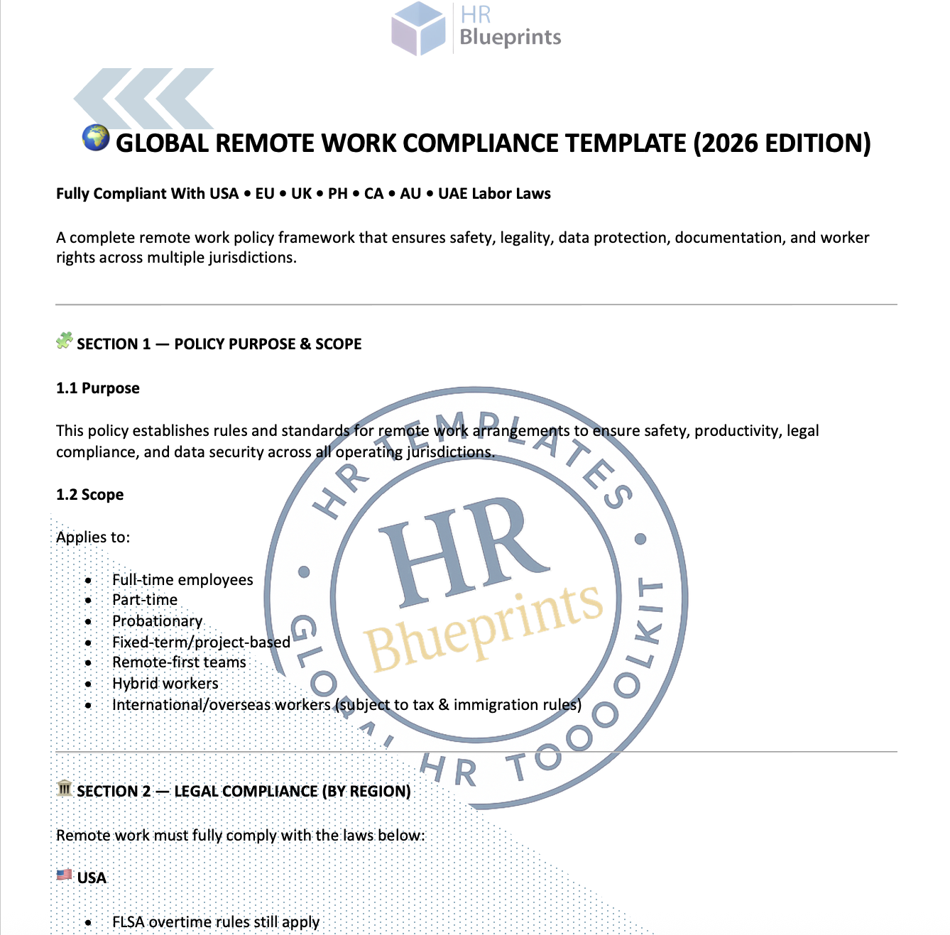 is an 8-page, fully editable policy system that helps HR teams and global companies run remote and hybrid work legally, safely, and audit-ready across the USA, EU, UK, Philippines, Canada, Australia, and UAE.