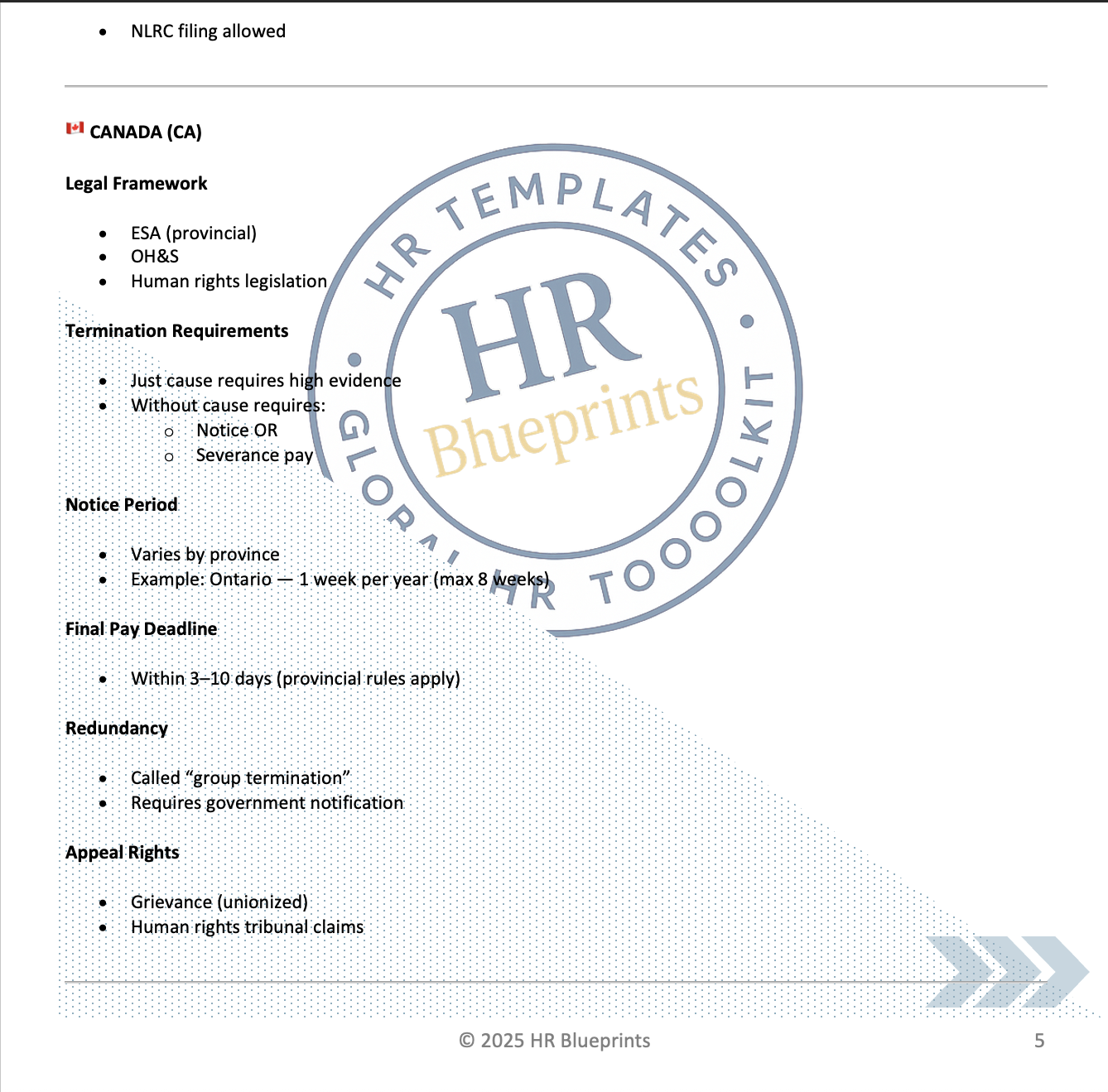 🇨🇦 CA – Just cause standard, without-cause notice or severance, provincial ESA, group terminations, human rights protections.