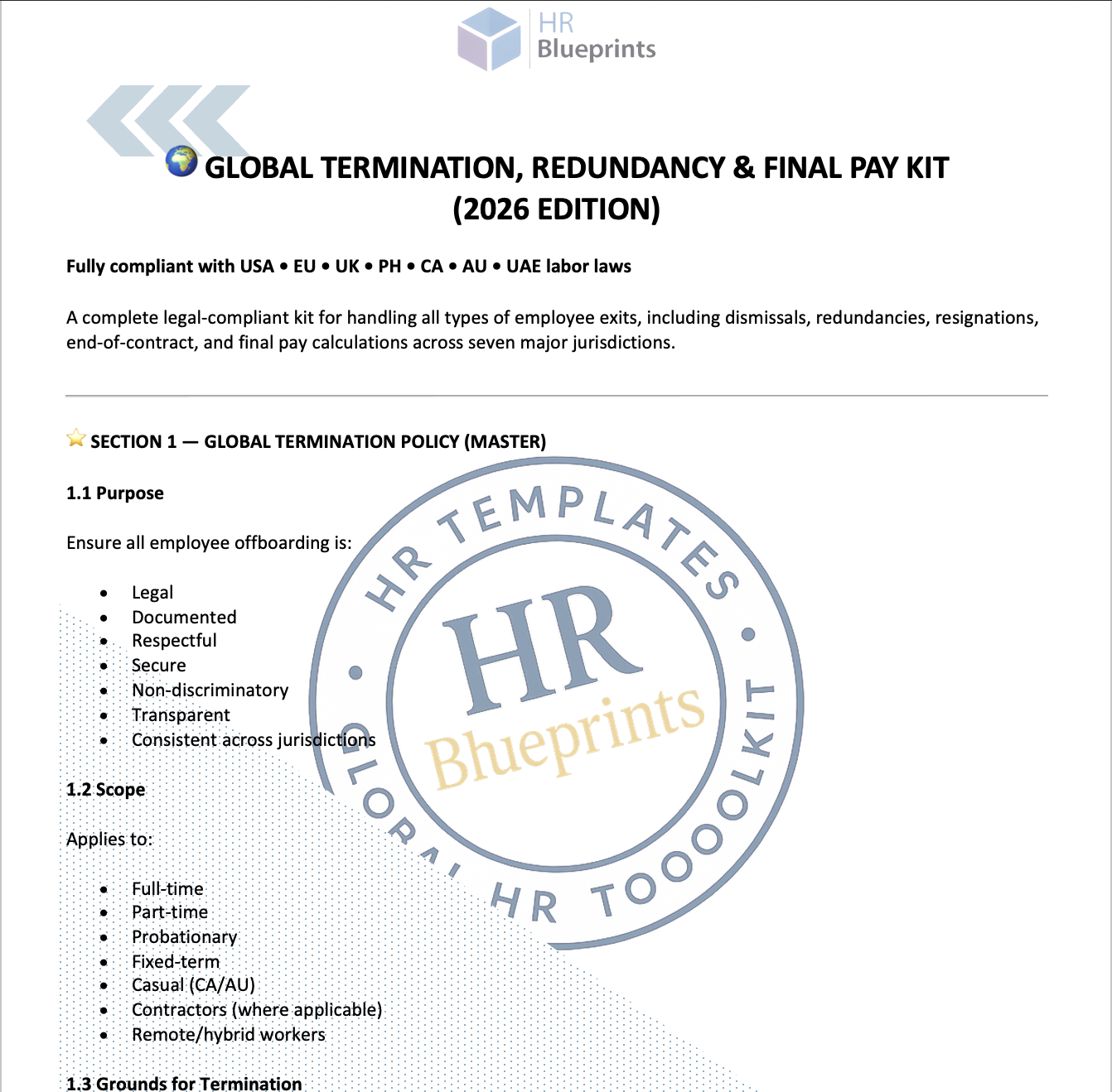 This 11-page global exit toolkit gives HR teams a complete, compliant system for managing terminations, redundancies, and final pay across seven major countries with policies, letters, checklists, calculators, and legal guidelines that reduce risk and keep every exit defensible.