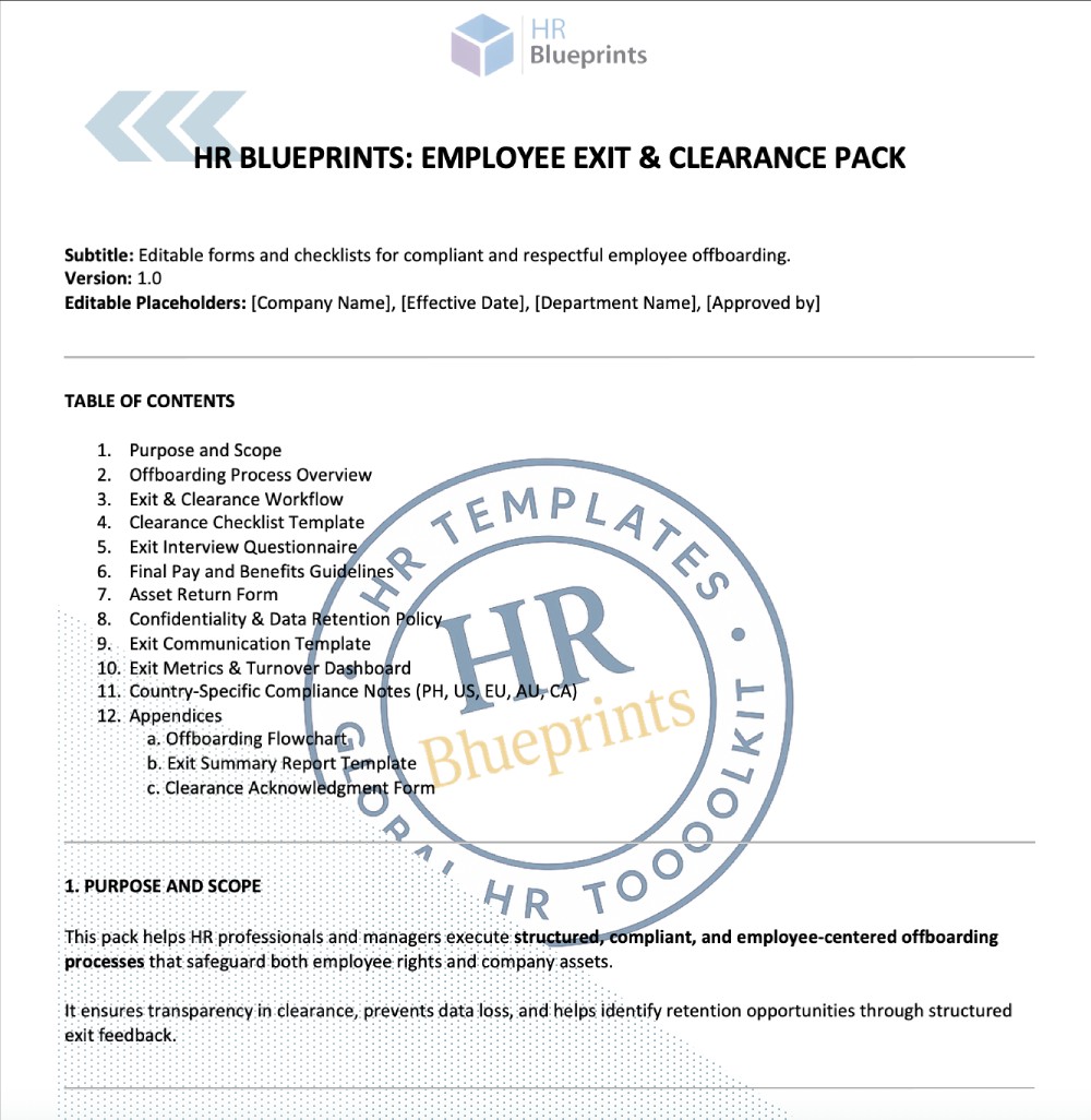 Clear exit guidelines, clearance forms, documentation checklists, and manager scripts to ensure compliant and professional offboarding.